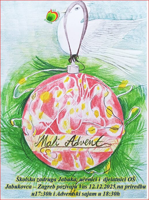 Školska zadruga Jabuka, učenici i djelatnici OŠ Jabukovca – Zagreb pozivaju Vas 12.12.2025. na priredbu u 17:30 h i Adventski sajam u 18:30 h